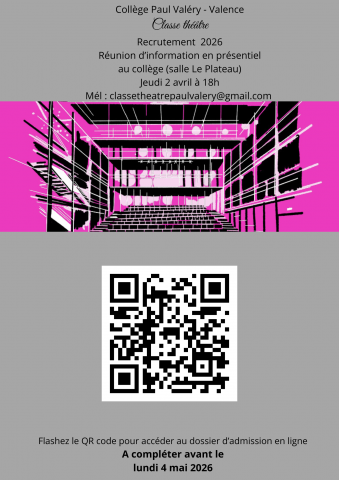 Le résumé dans l'article. Cliquez sur l'image!!! CLASSE THÉÂTRE 2026/2027: cliquer sur l'affiche pour un QR code plus grand! LE BILAN! PROJET POEME "EAU SECOURS" par les élèves allophones!!! Pièce de théâtre au collège Paul Valéry! Comme l'a dit Corneille dans Le Cid "Aux âmes bien nées, la valeur n'attend point le nombre des années..." le collège Paul Valéry propose... OPTION LATIN OPTION CHORALE CLASSE THÉÂTRE CLASSE CHAM SECTION BADMINTON